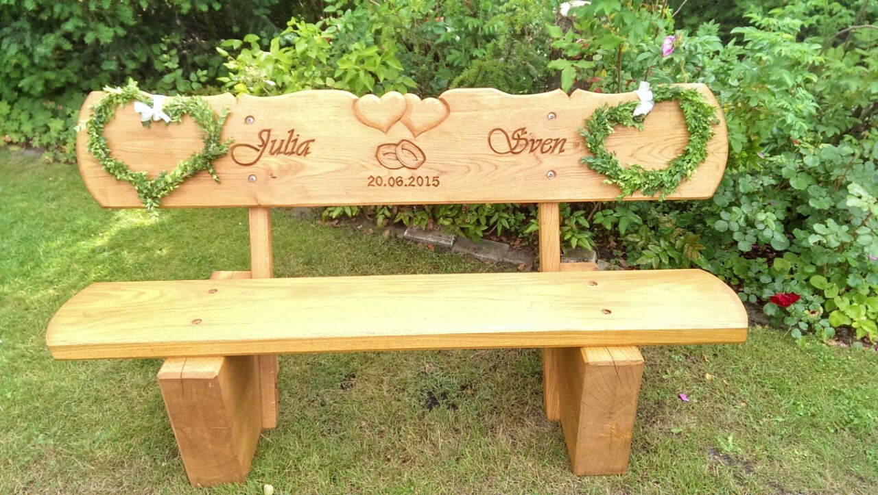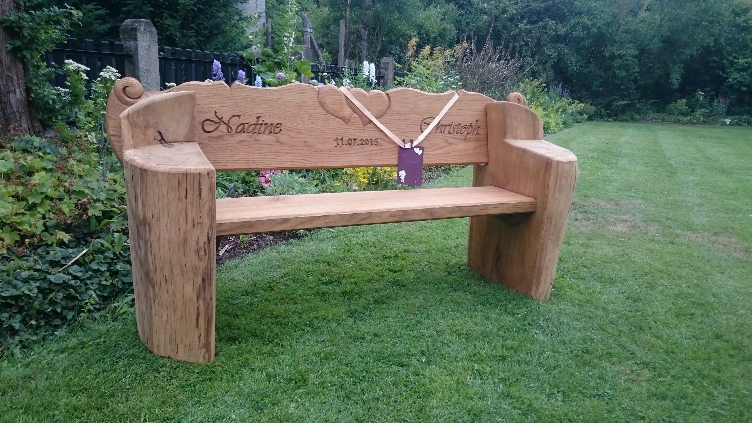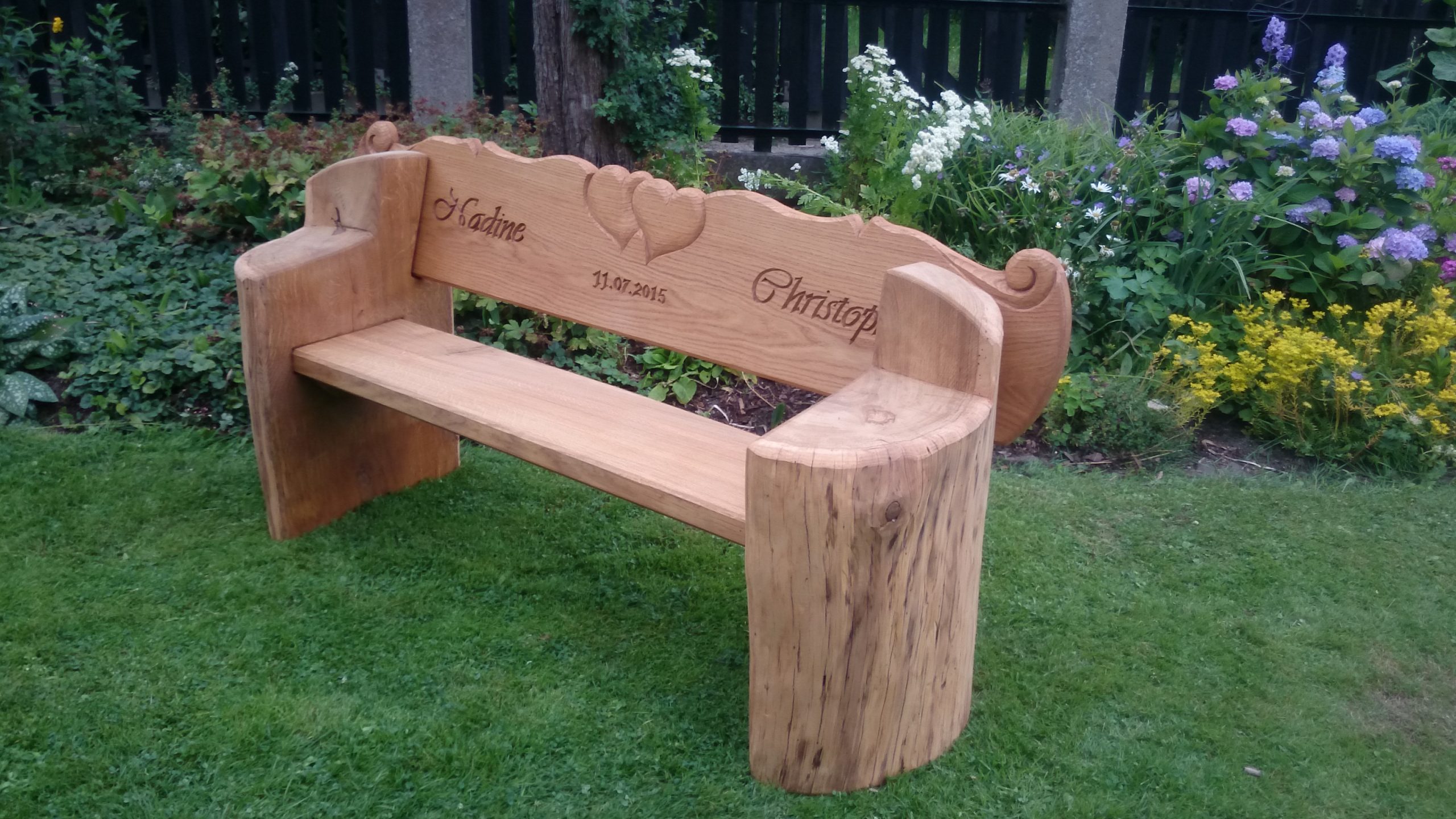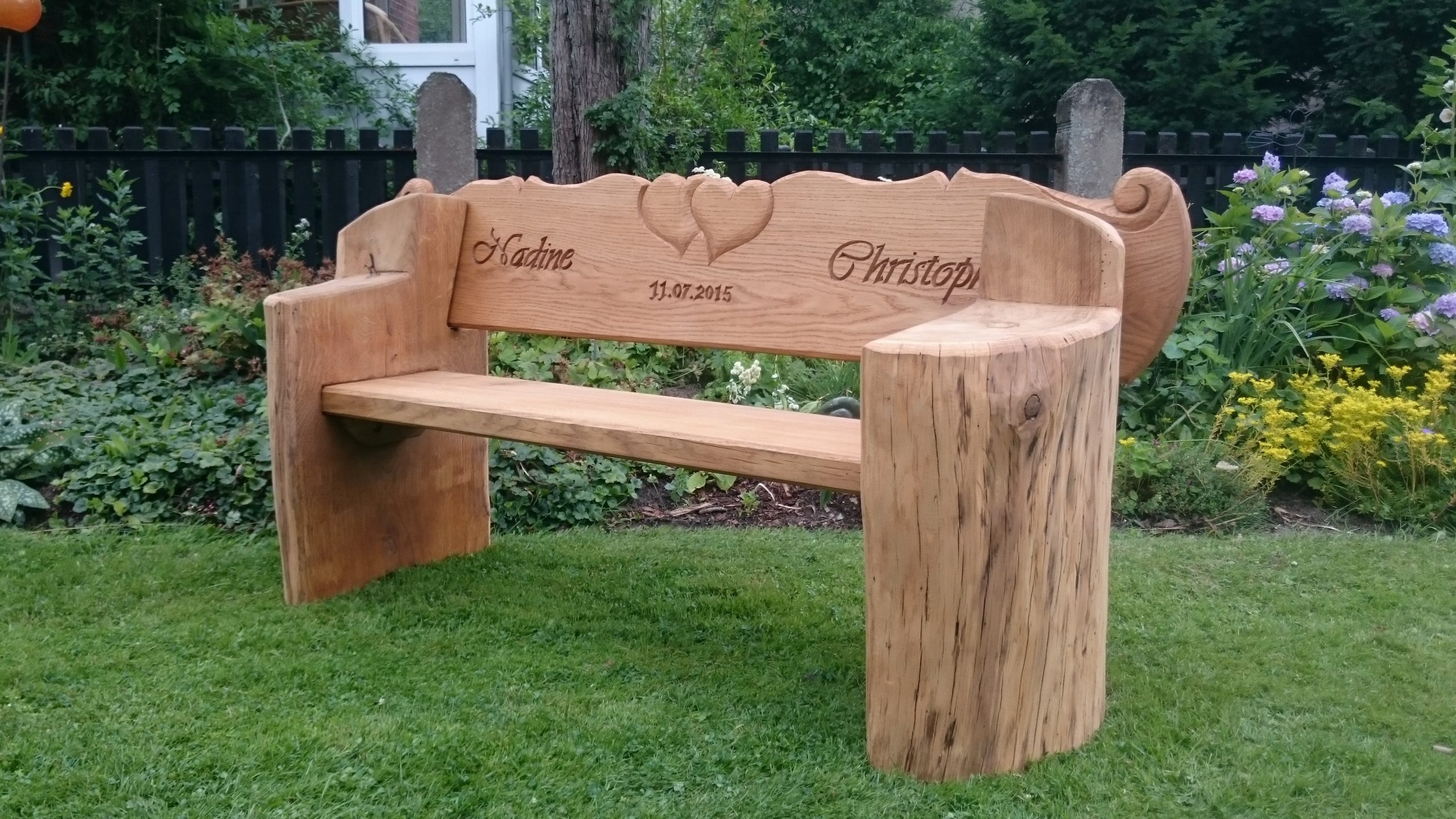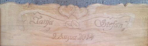 Wie auf den Galeriebildern zu sehen, können wir auch jegliche Art von Gravuren in Ihrer Eichenbank realisieren.
